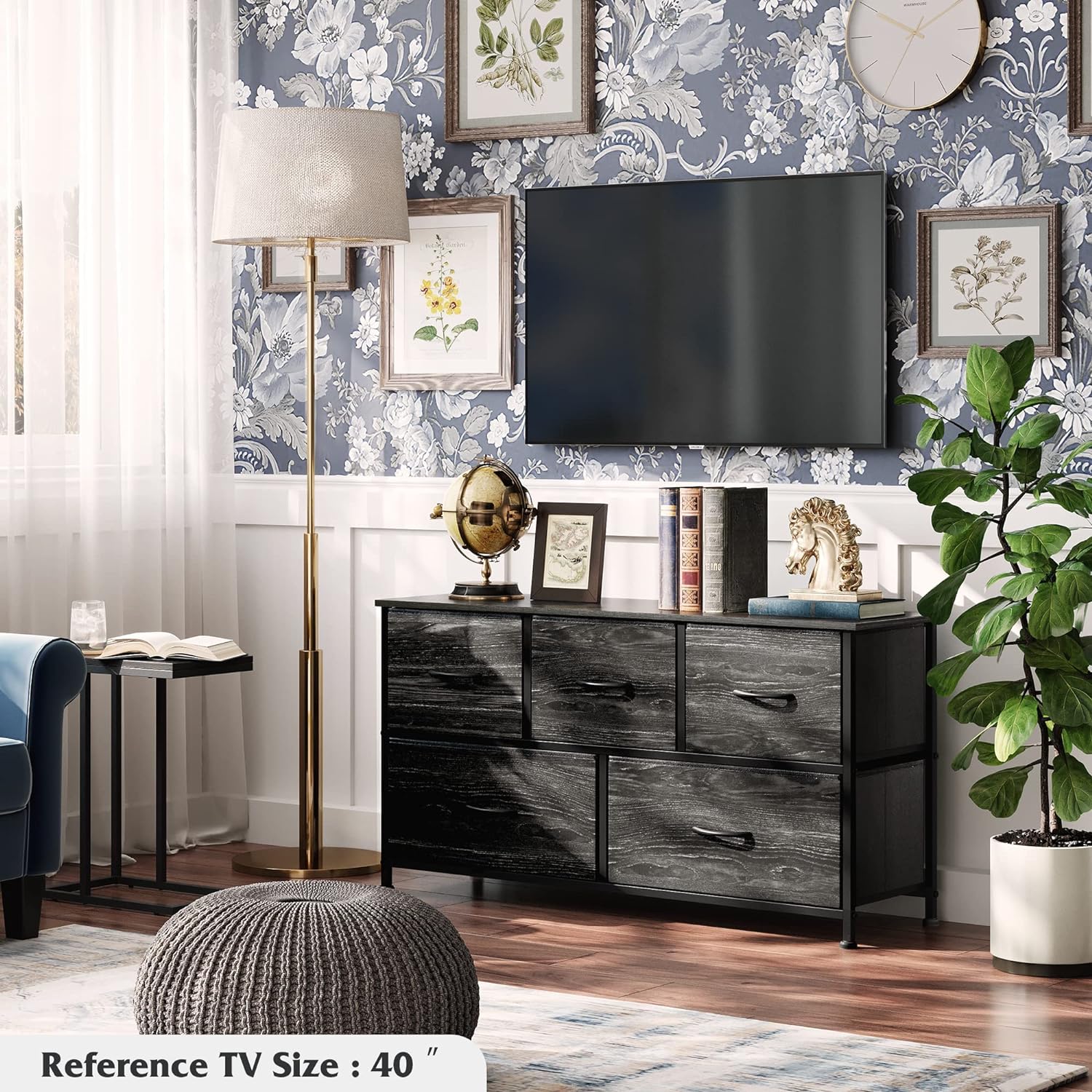 Introducing the WLIVE Dresser for Bedroom with 5 Drawers, the perfect addition to any bedroom, living room, or hallway. This wide chest of drawers features a sleek charcoal black wood grain print that will complement any décor style.