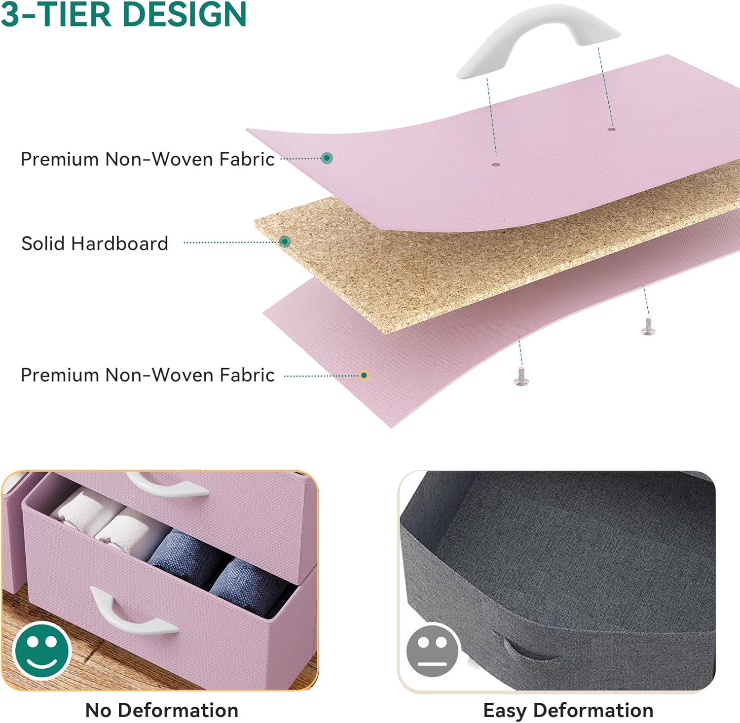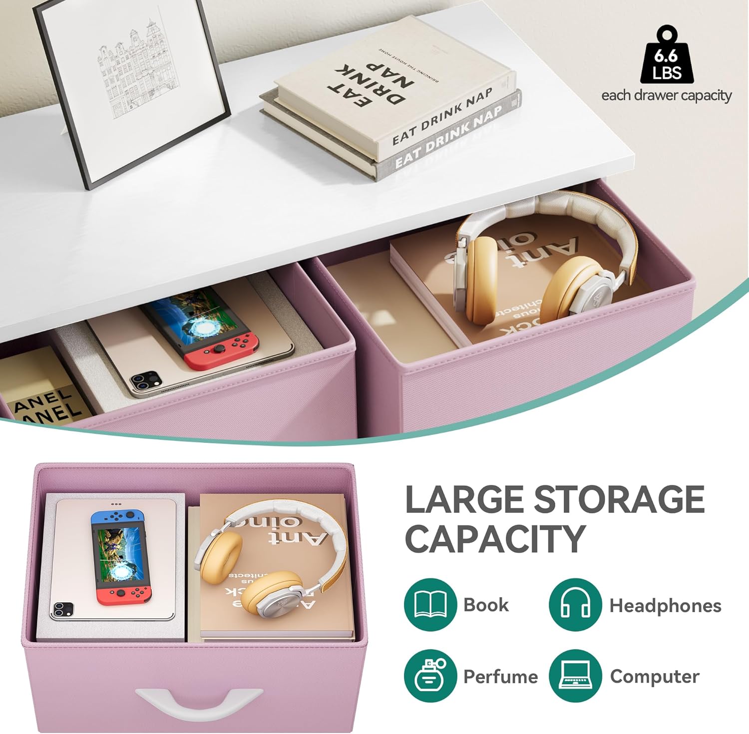 Crafted with a sturdy steel frame and a durable wooden top, this dresser is built to last. The easy pull fabric bins in a stylish pink color add a touch of elegance to any space, making it a versatile and functional piece for your bedroom, living room, or closet.